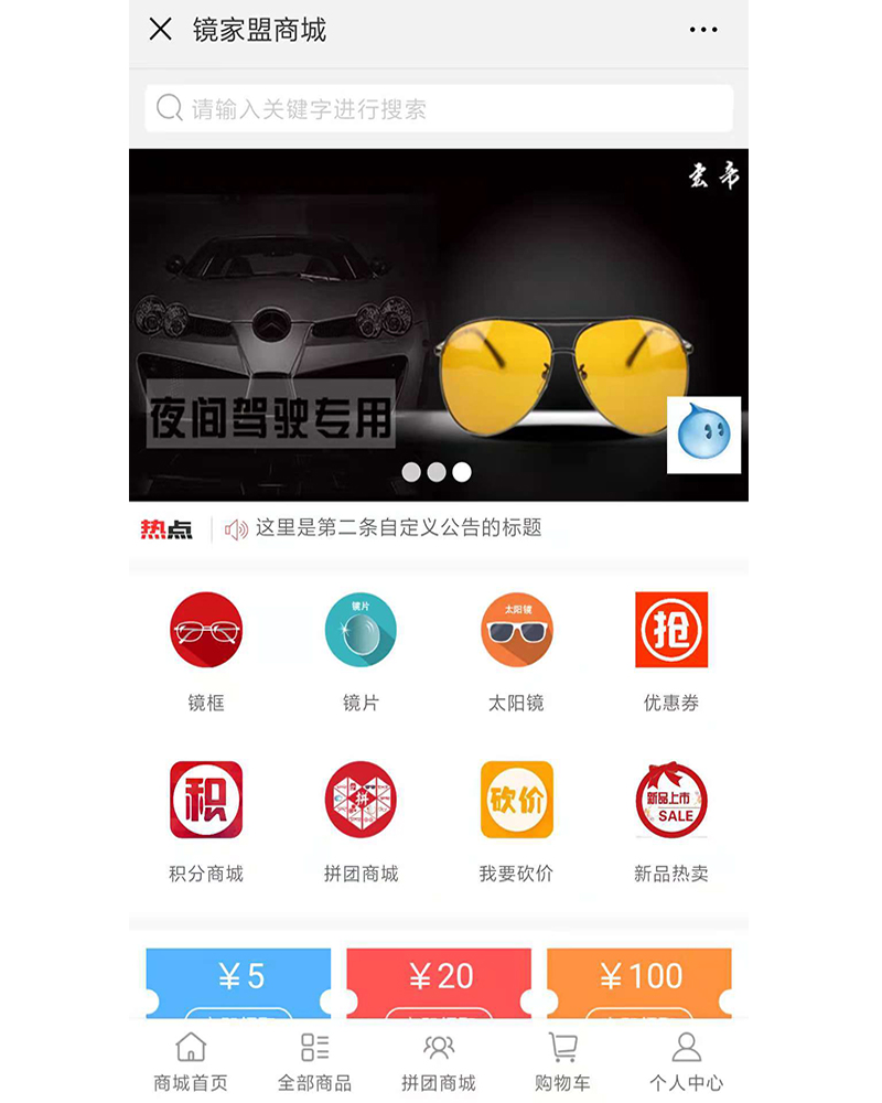 該應用是專為眼鏡愛好者的購物公眾號,設計開發(fā)積分商城、拼團、砍價等功能模塊。